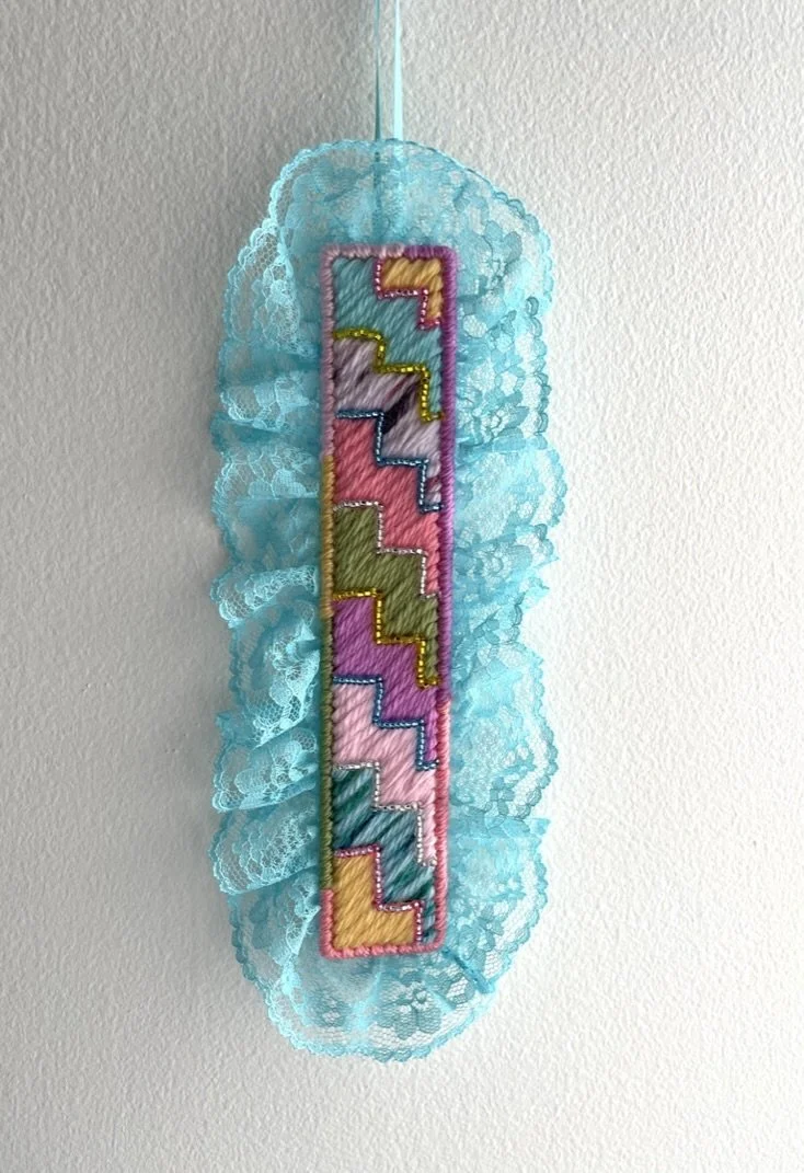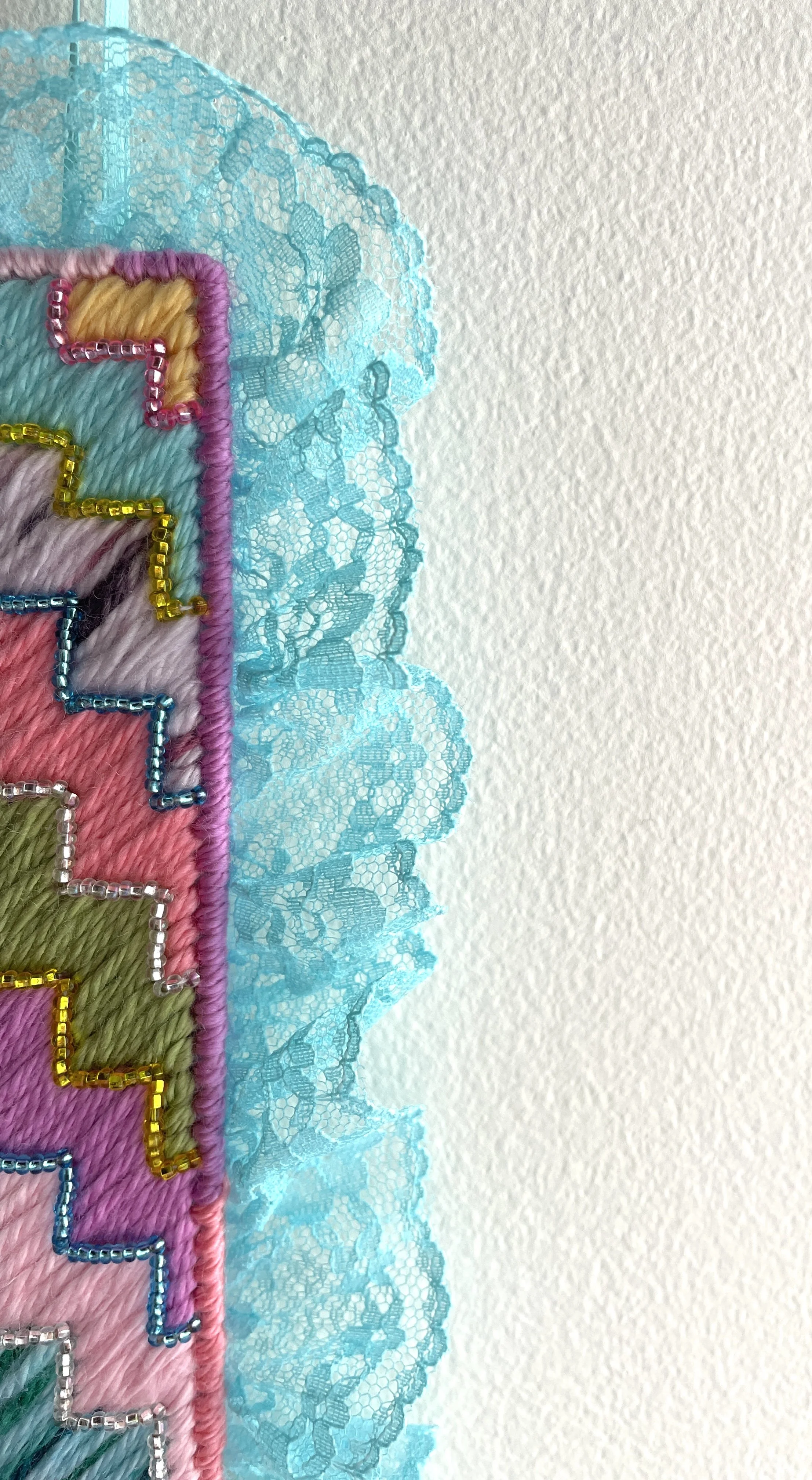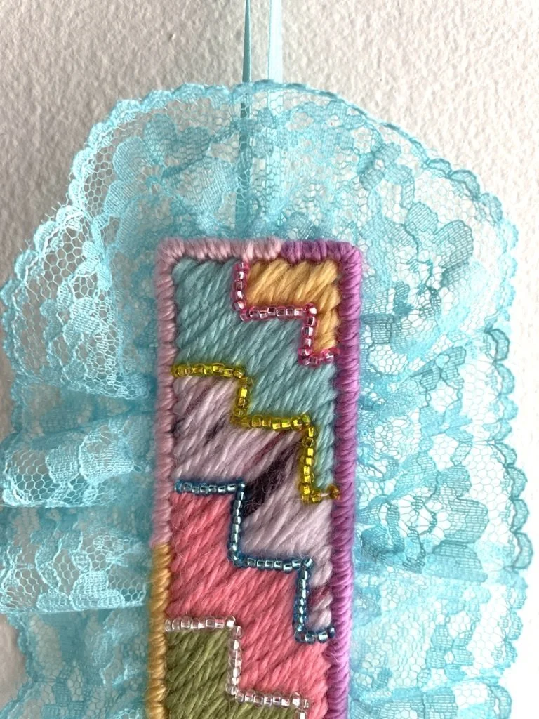 lorna doone (2024) hand-beaded bargello needlepoint with acrylic yarn, lace trim, seed beads, and satin ribbon on plastic canvas