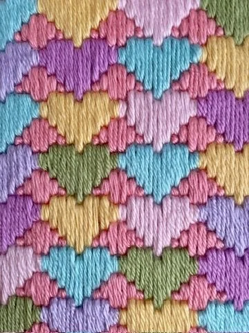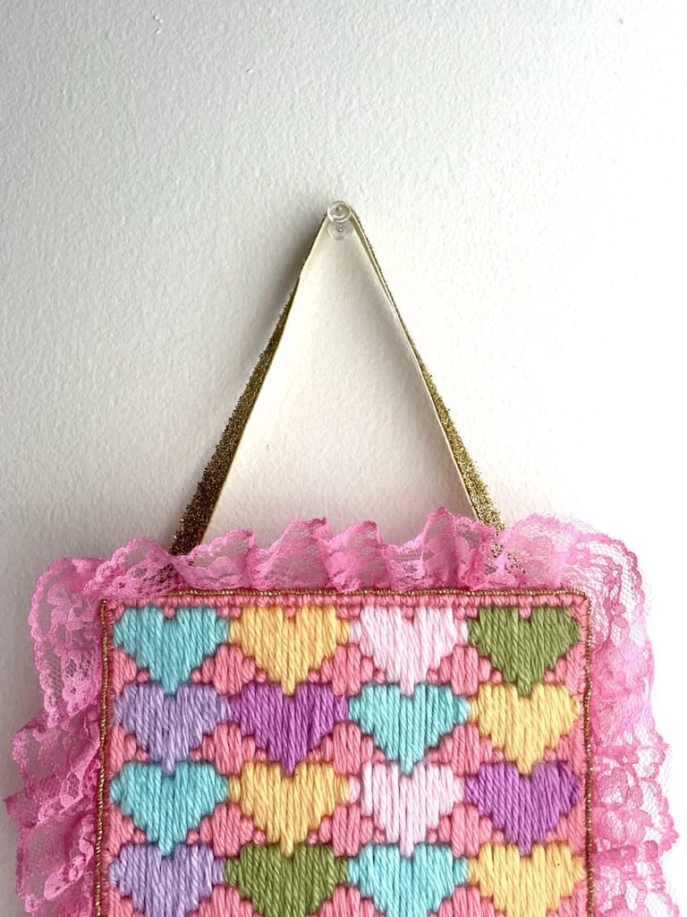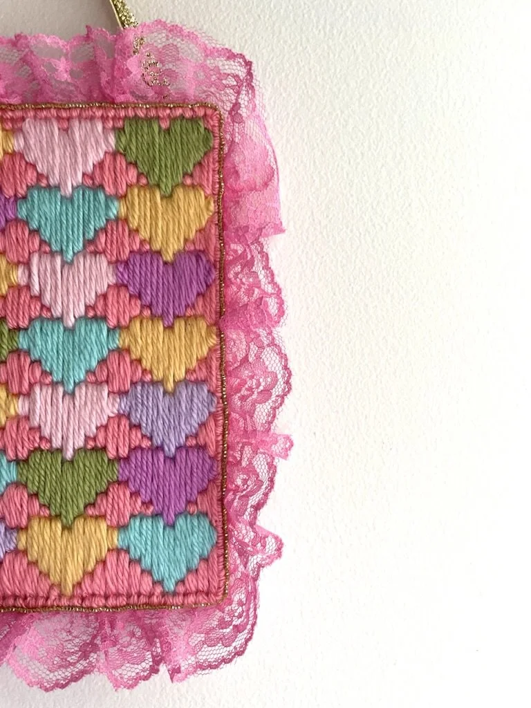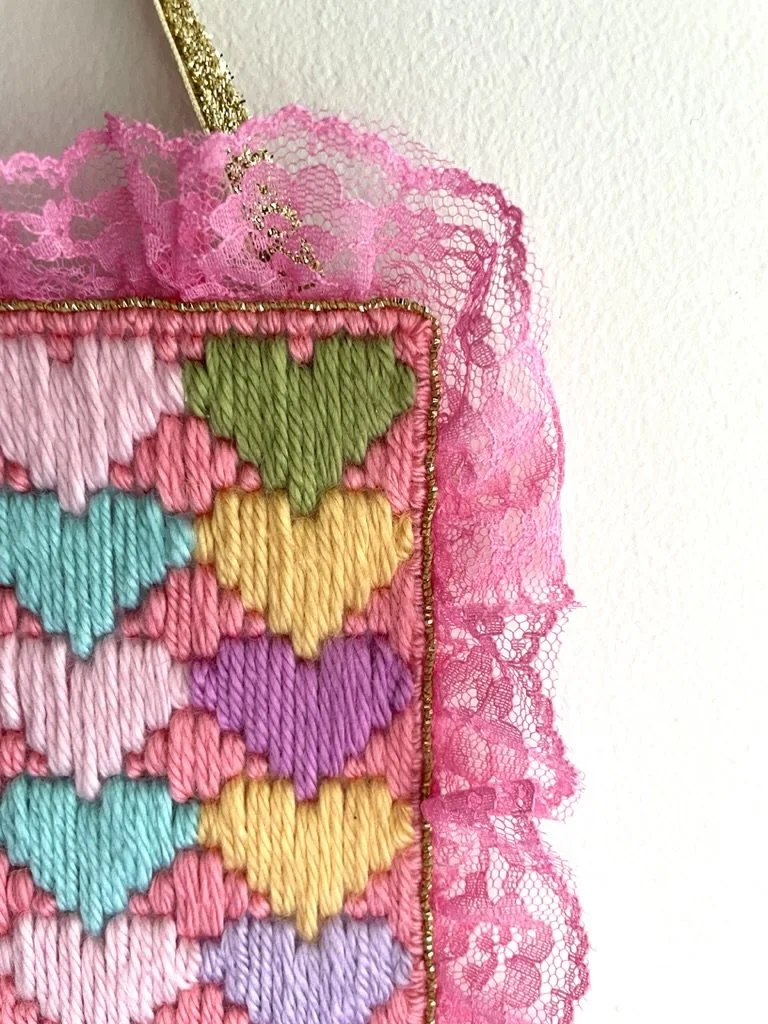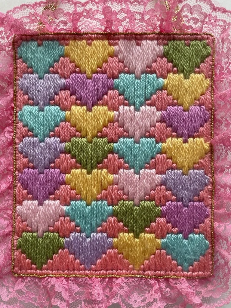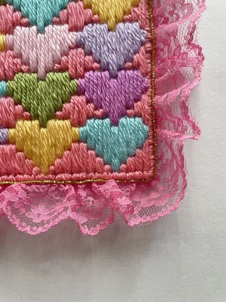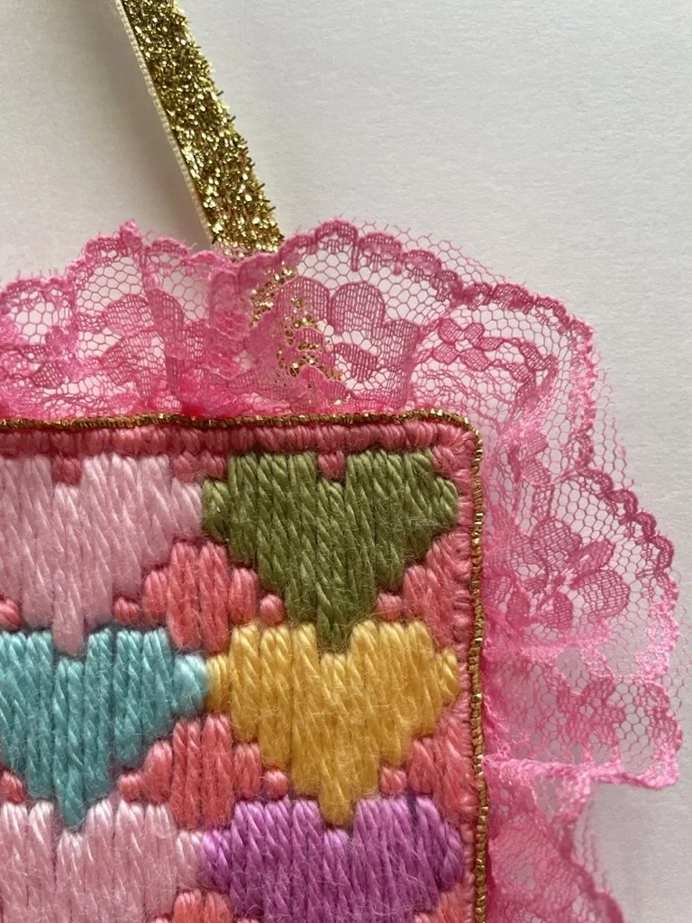 maxine (2024) bargello needlepoint with acrylic yarn, lace trim, textured metallic ribbon, and hand-embroidered gold thread on plastic canvas