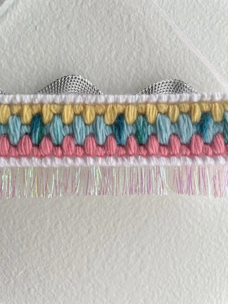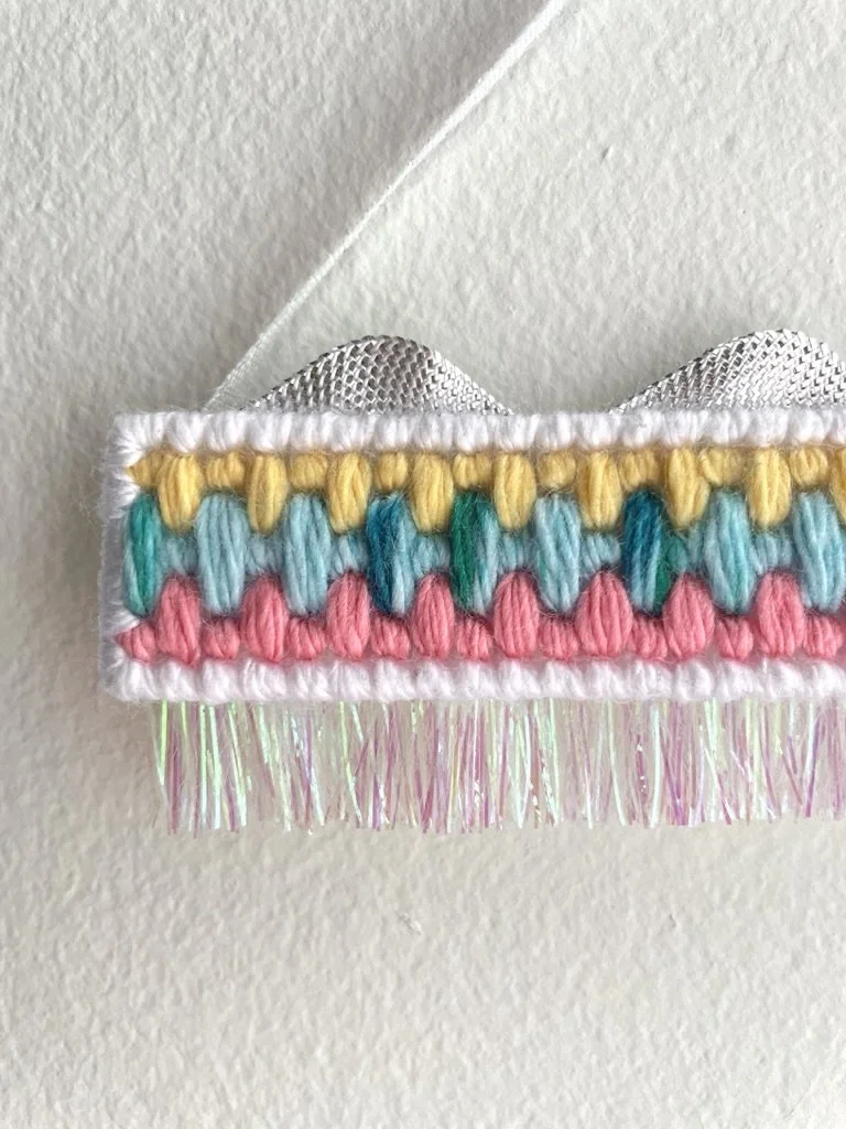 sugar (2024) bargello needlepoint with acrylic yarn, holographic fringe, metallic ric rac trim, and metallic ribbon on plastic canvas