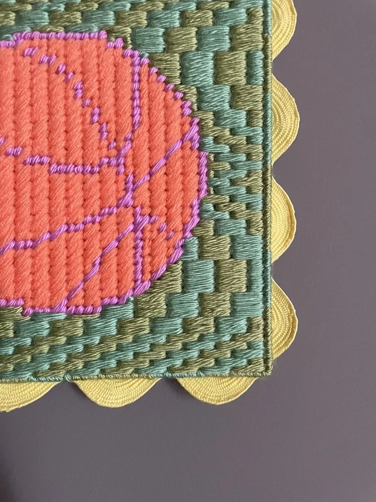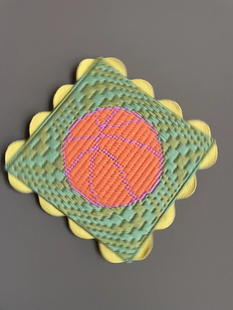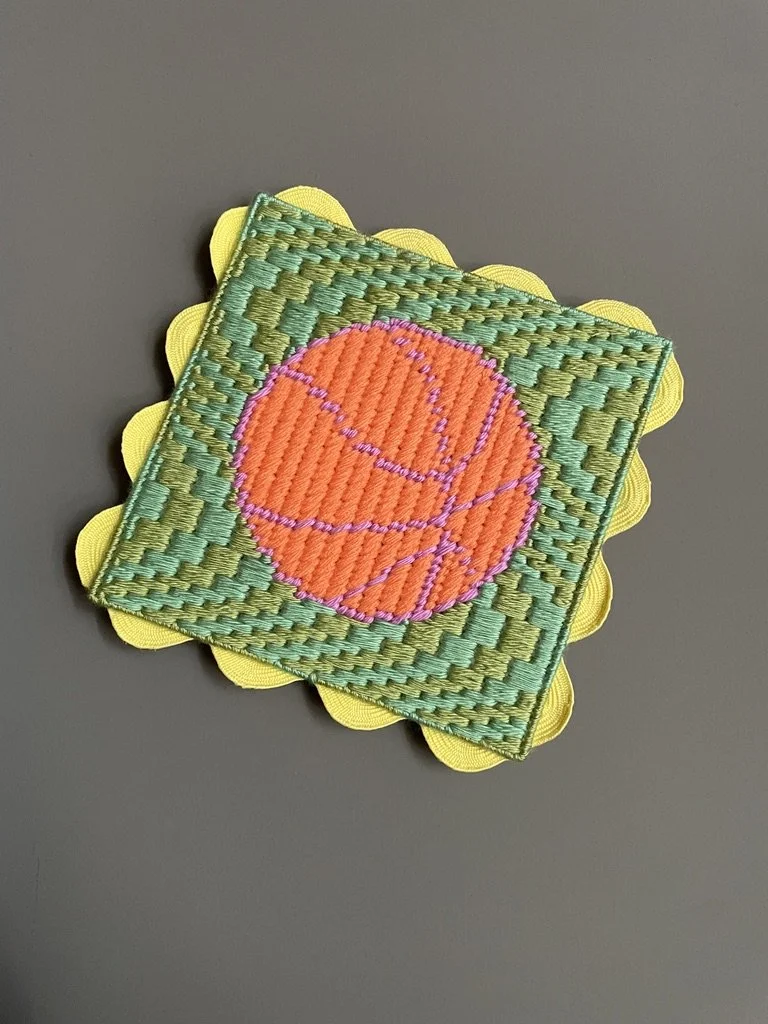 ball is life (2024) bargello needlepoint with acrylic yarn and ric rac trim on plastic canvas mounted on a 360° swivel