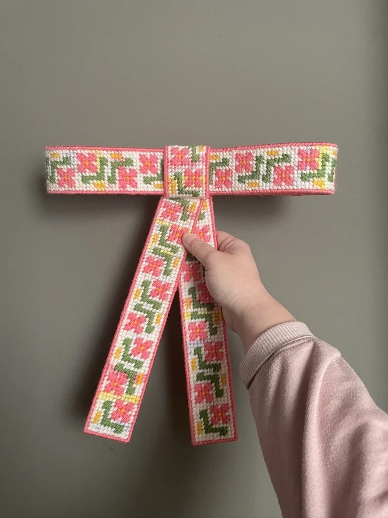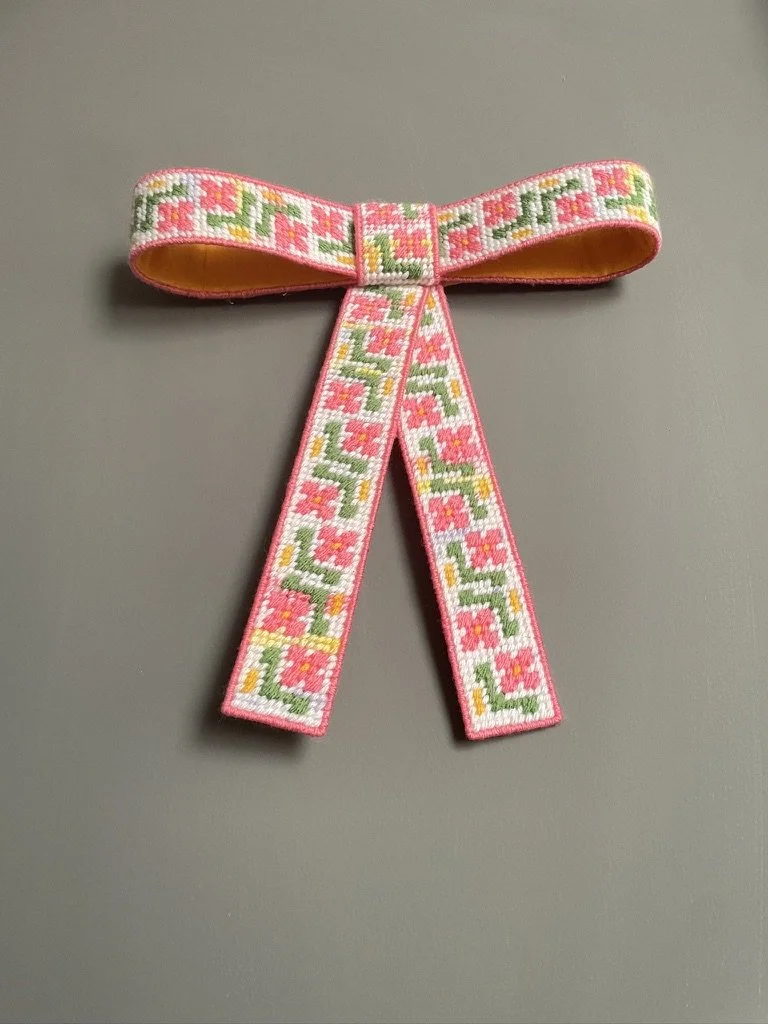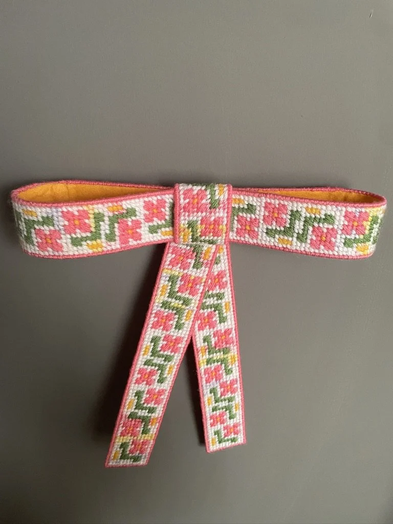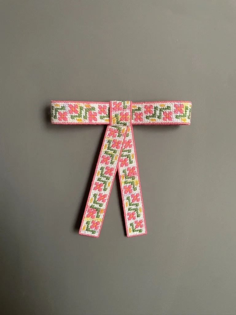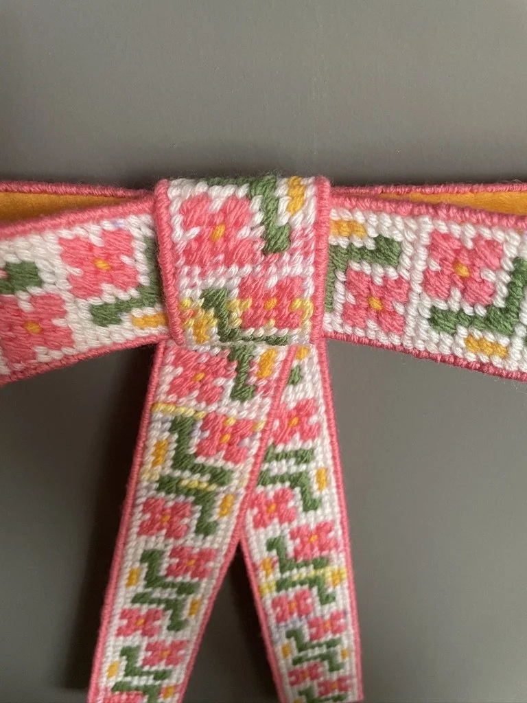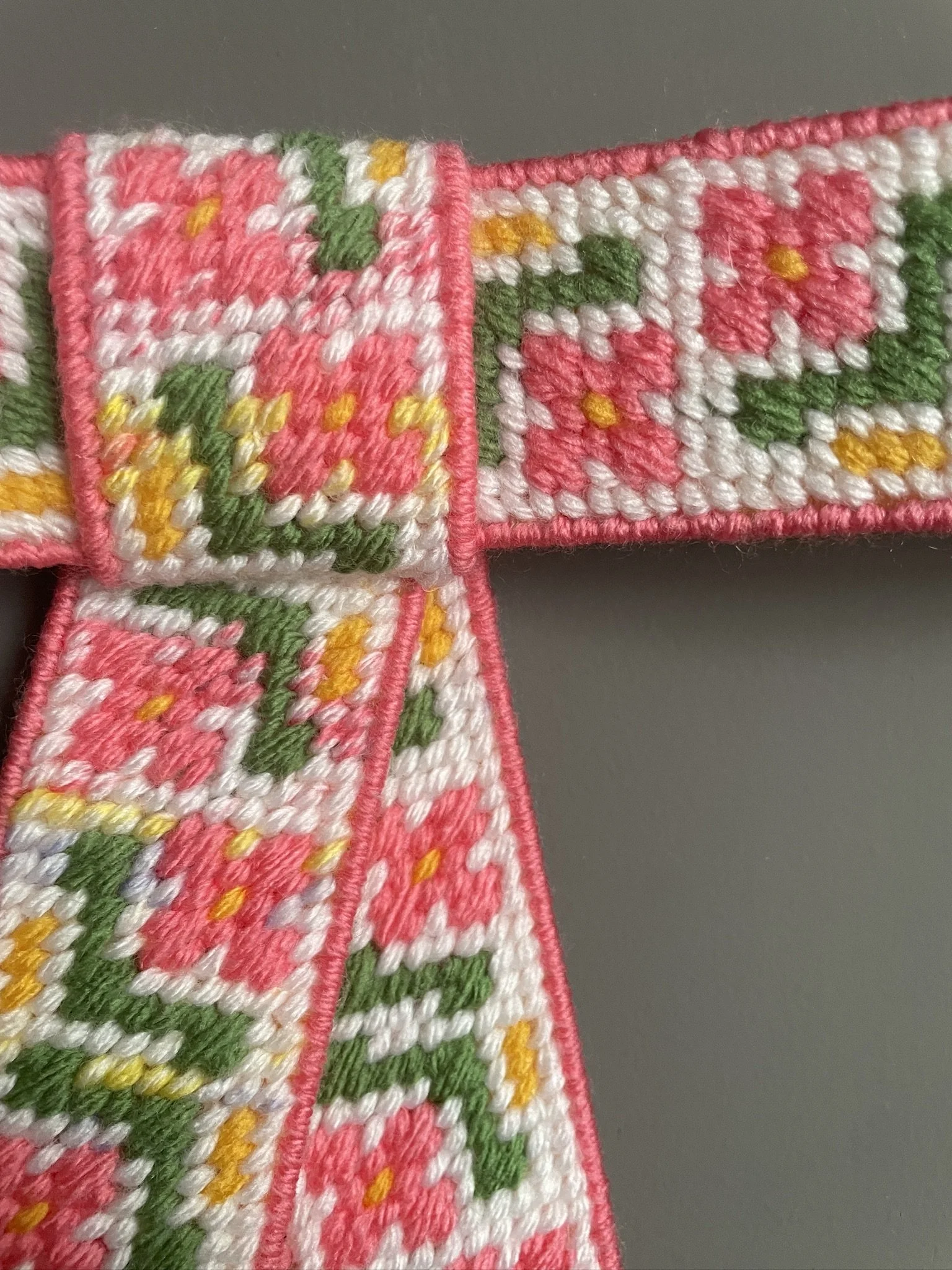 selena (2024) structured 3D bargello needlepoint with acrylic yarn and acrylic felt on plastic canvasmeasuring about 12” in diameter