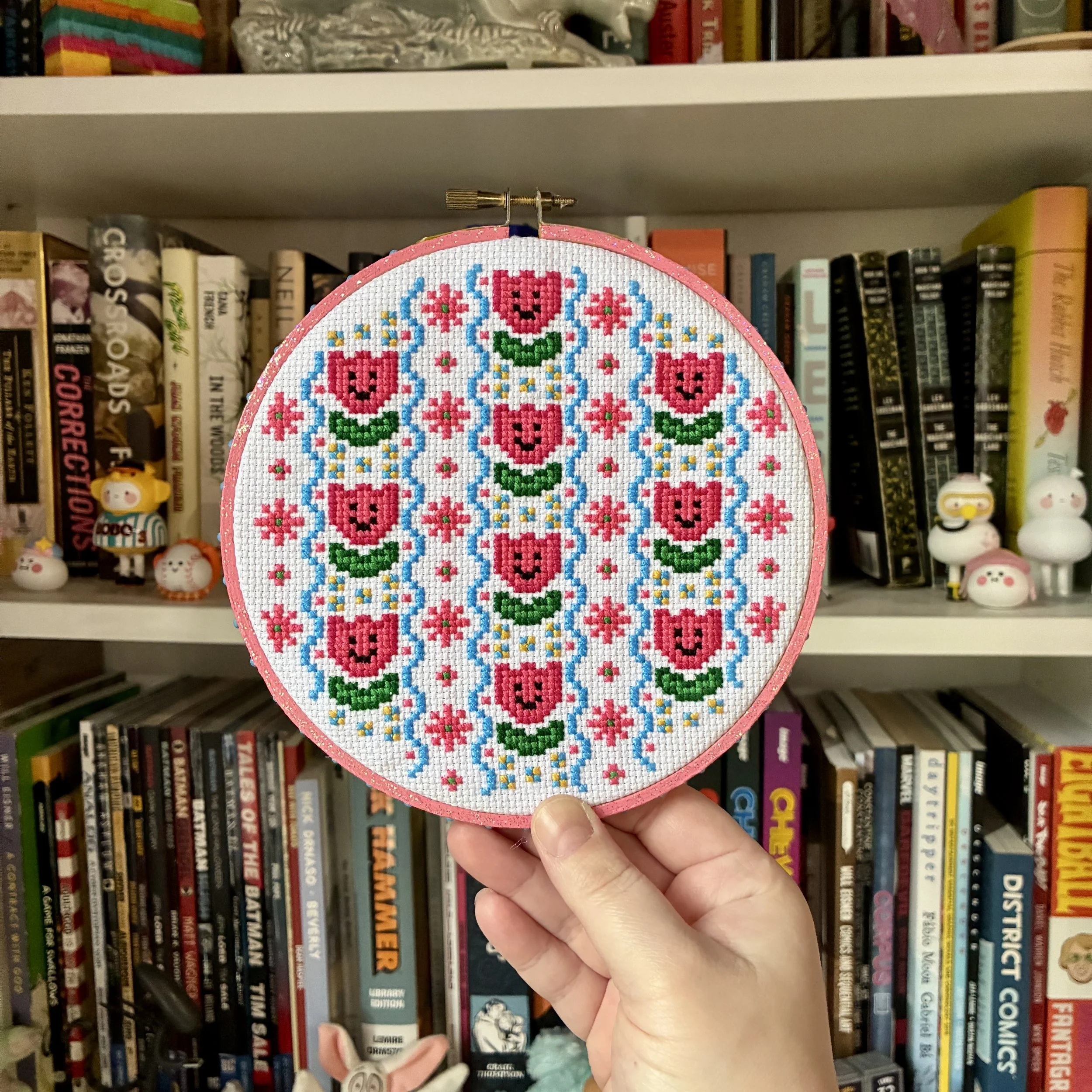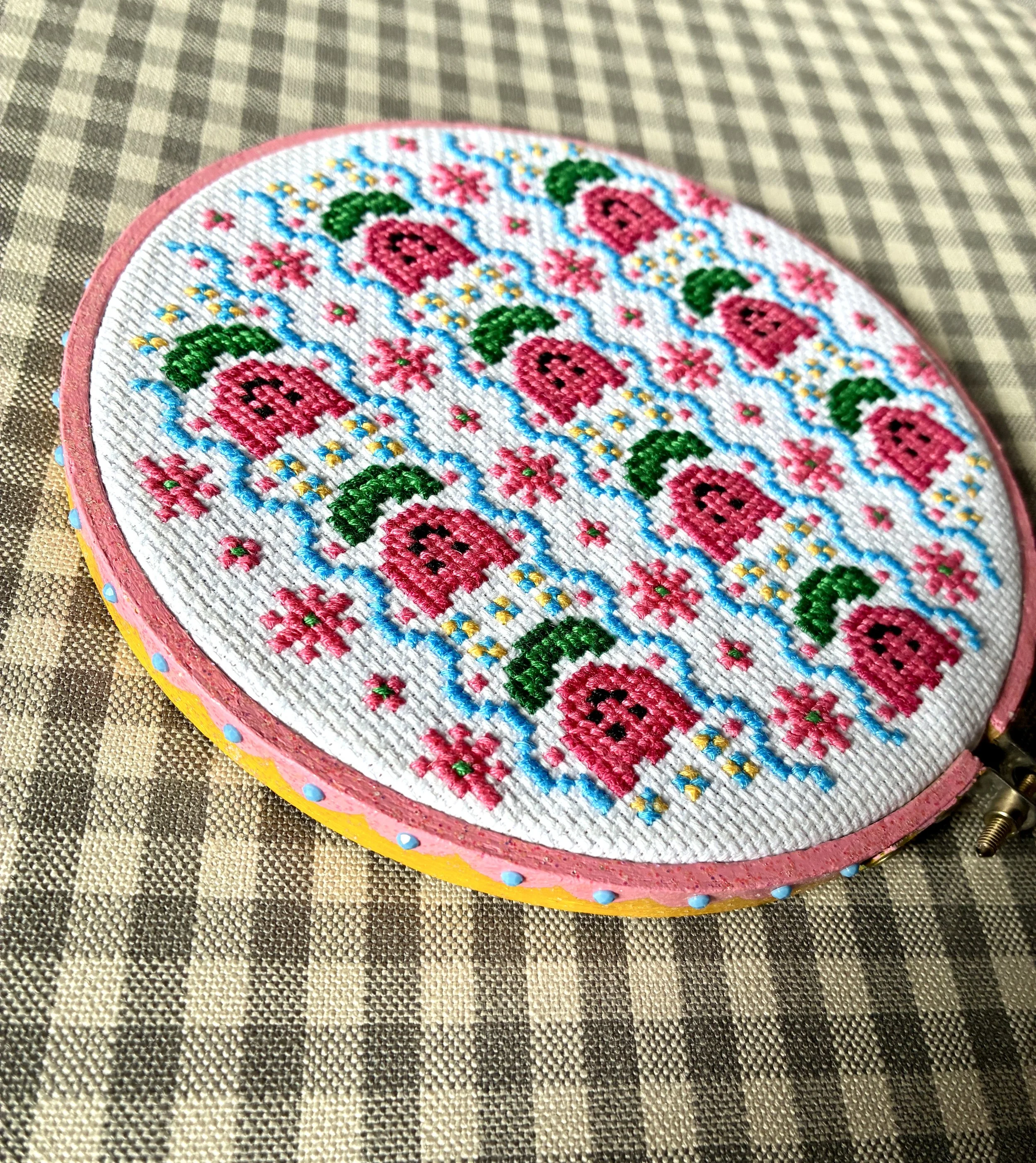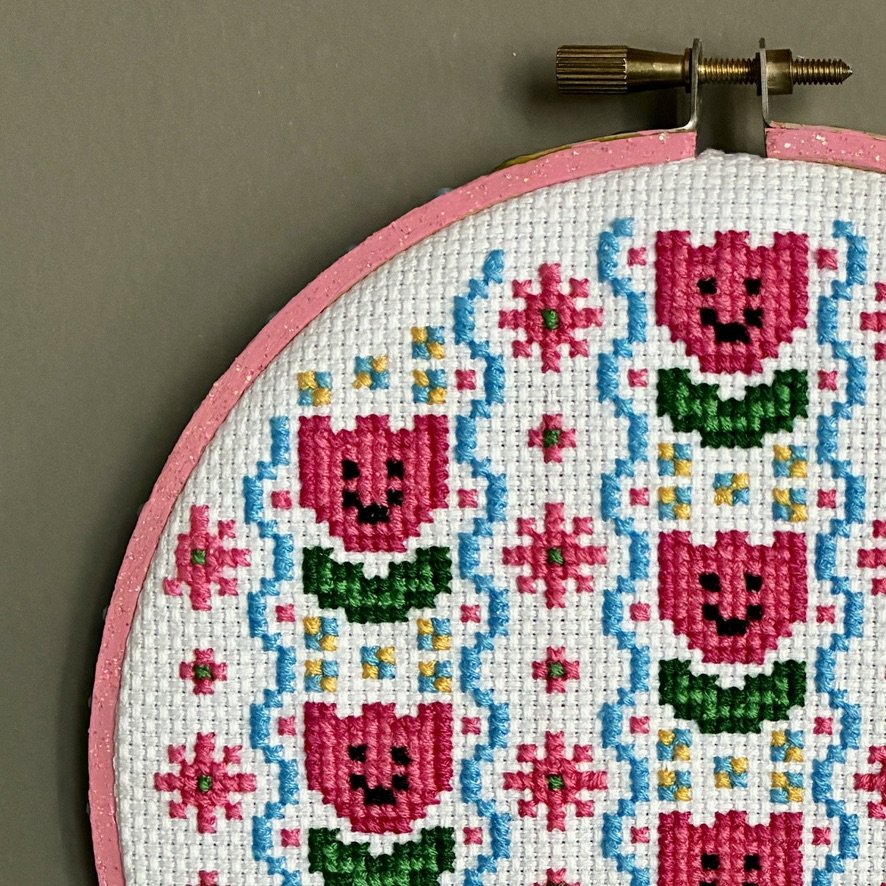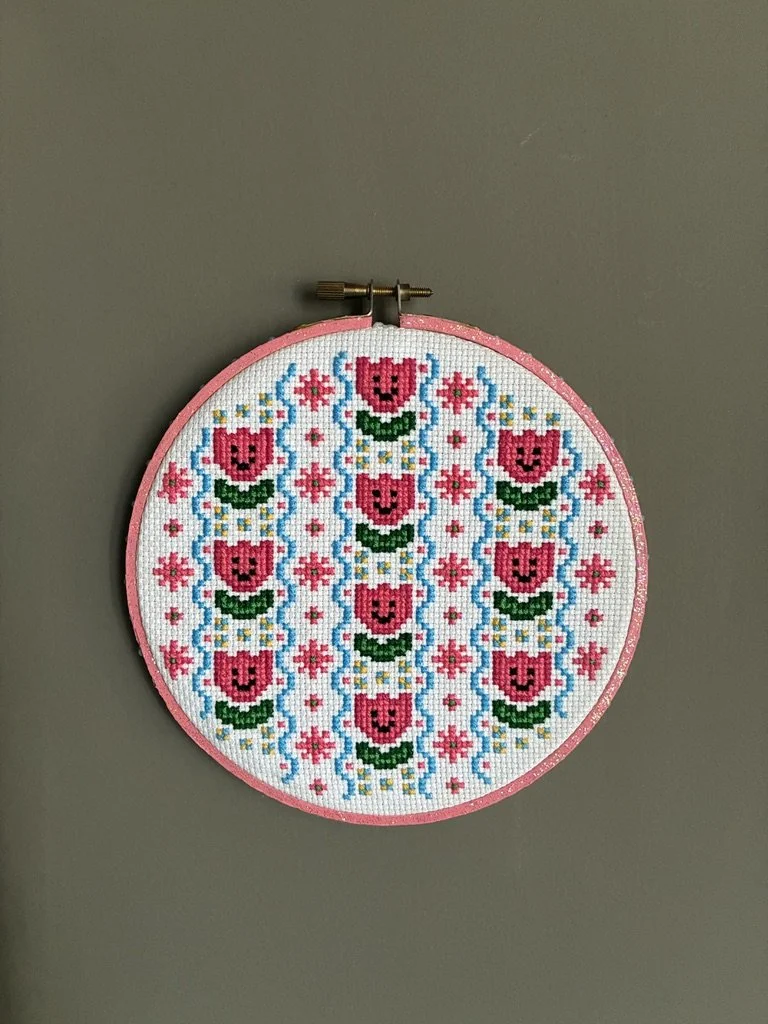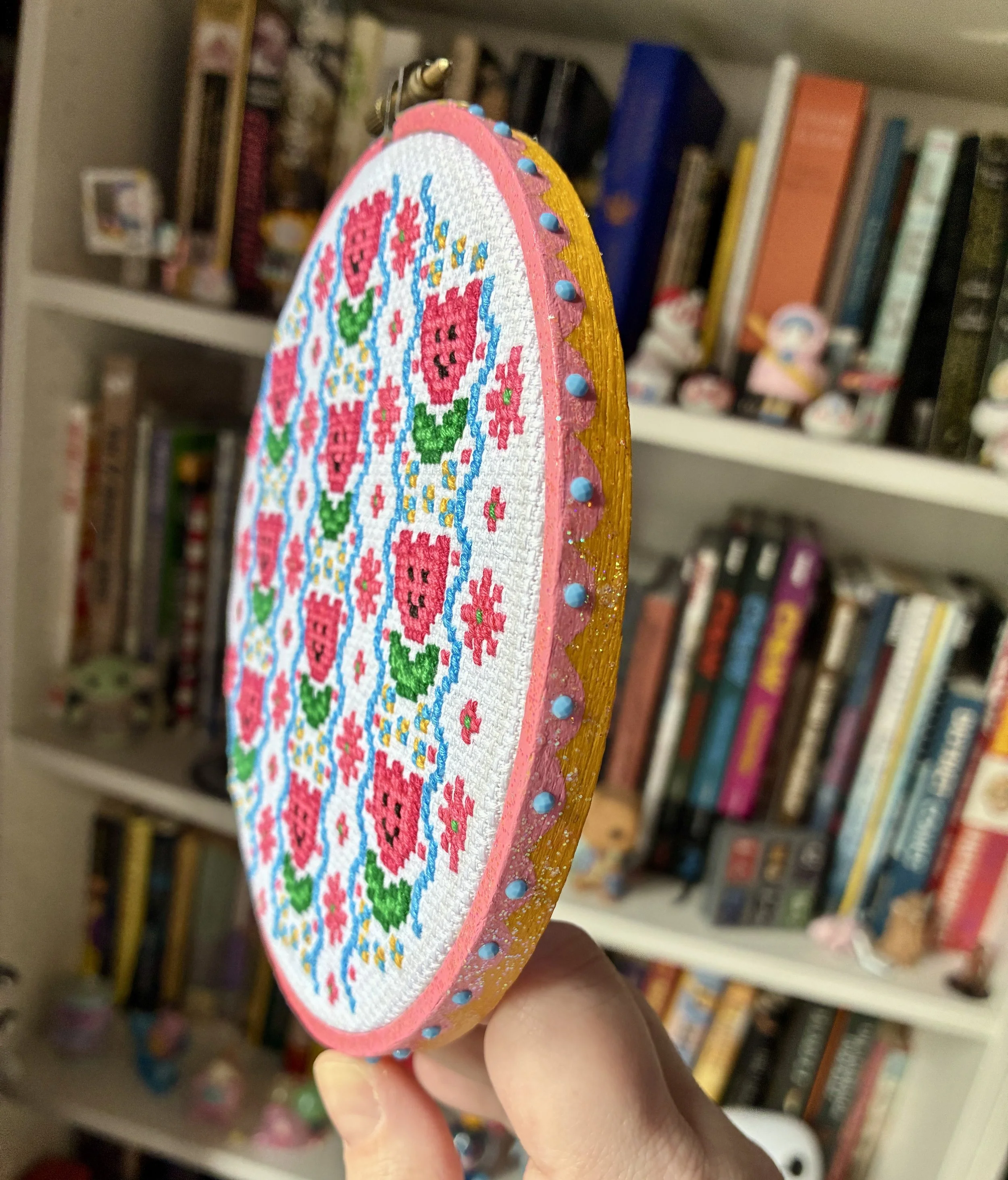 original cross stitch design on cotton 14 aida with DMC cotton floss and hand painted bamboo hoop with acrylic paint, glitter, and acrylic gems