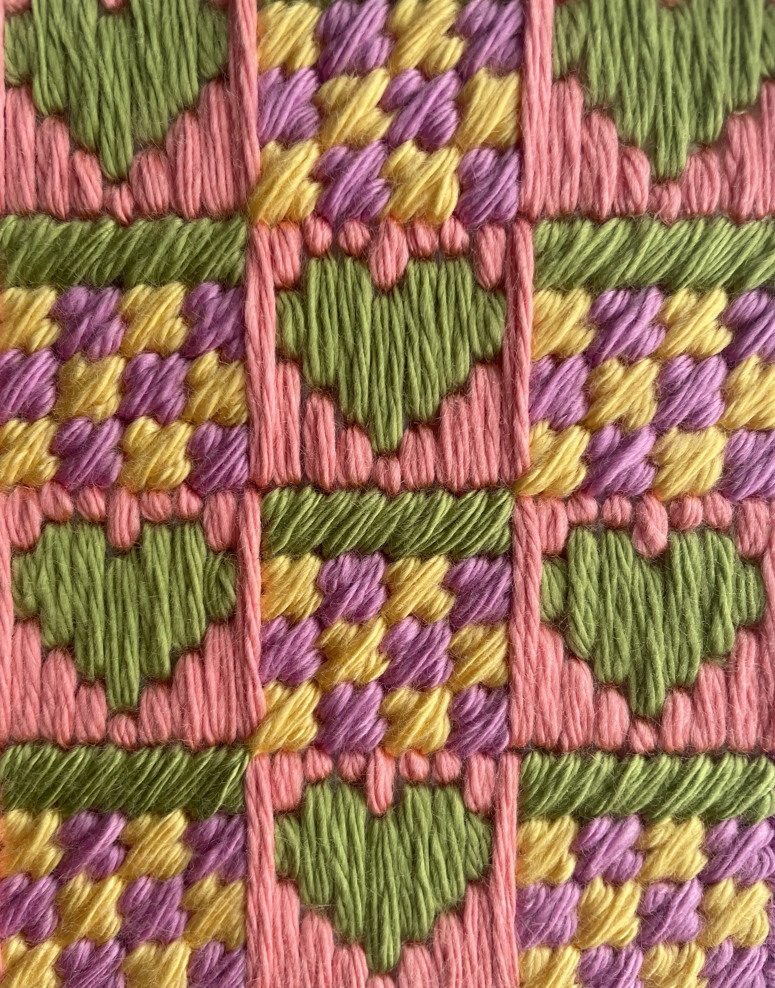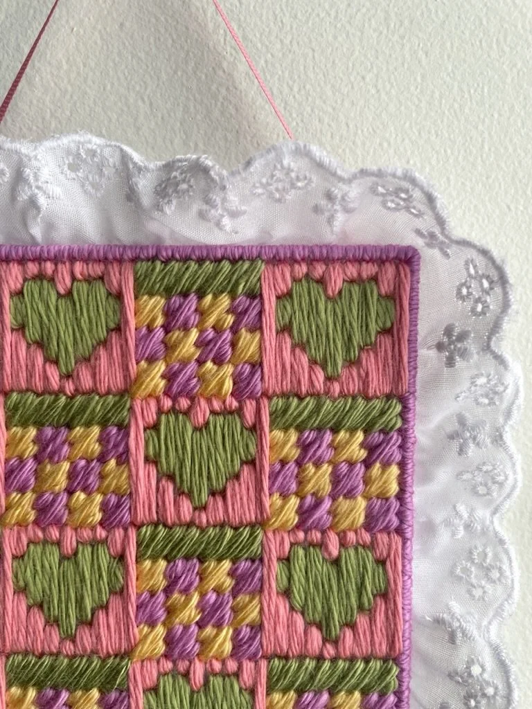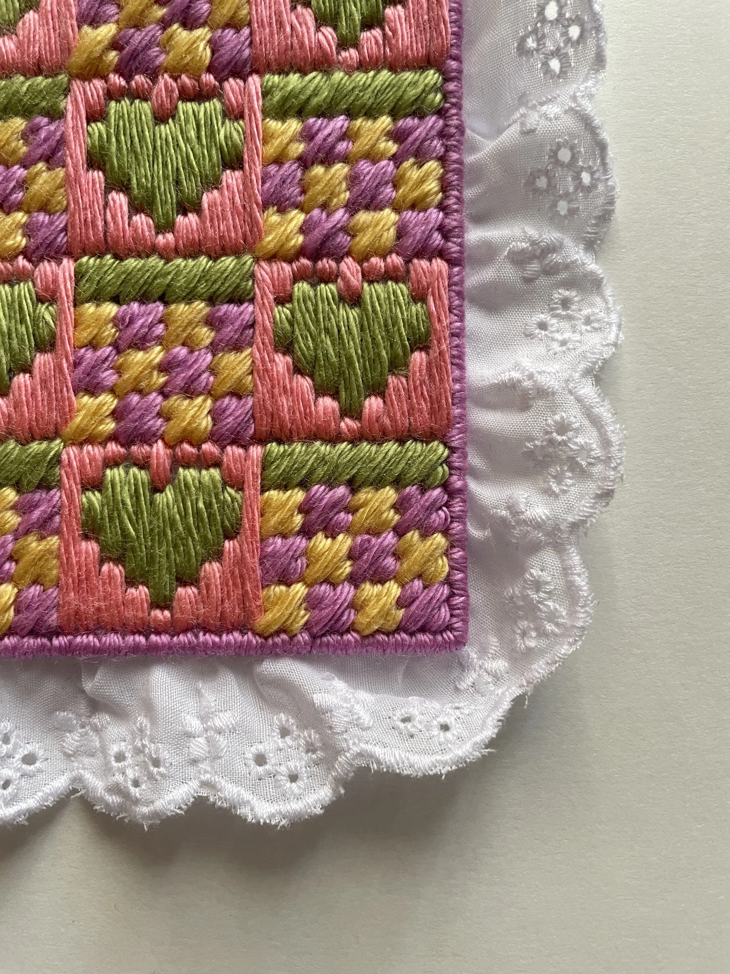 greta (2024) bargello needlepoint with acrylic yarn, eyelet lace trim, and grosgrain ribbon on plastic canvas